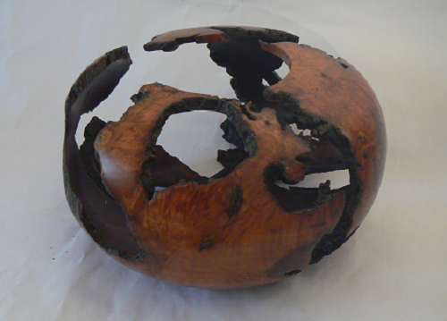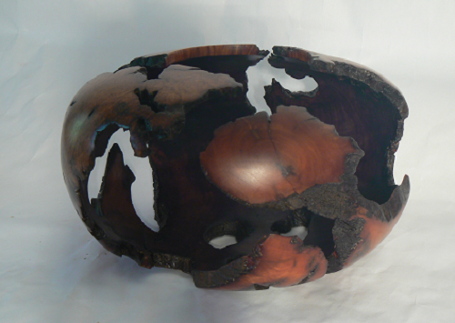 Description: The last large piece from a karree stump I obtained some years ago and the most challenging bowl I have ever attempted. Much of the wood was decayed or had disappeared through veld fire etc. Turning speed was slow (500 rpm max) because it was unbalanced and light tool pressure necessary because of the many voids. A very sharp edge was needed at all times and I used Blackline cutting inserts for shaping the outside and hollowing. I wore gloves and a Stihl hard hat with facemask when turning. One section came adrift but was reattached using two blackwood inserts. All sanding was by hand off the lathe and the outer surface has been bleached while the inside coloured with a diluted black dye to give contrast to the bowl. The bowl measures 30 x 20 cm and well over 60 hours was spent working on it.