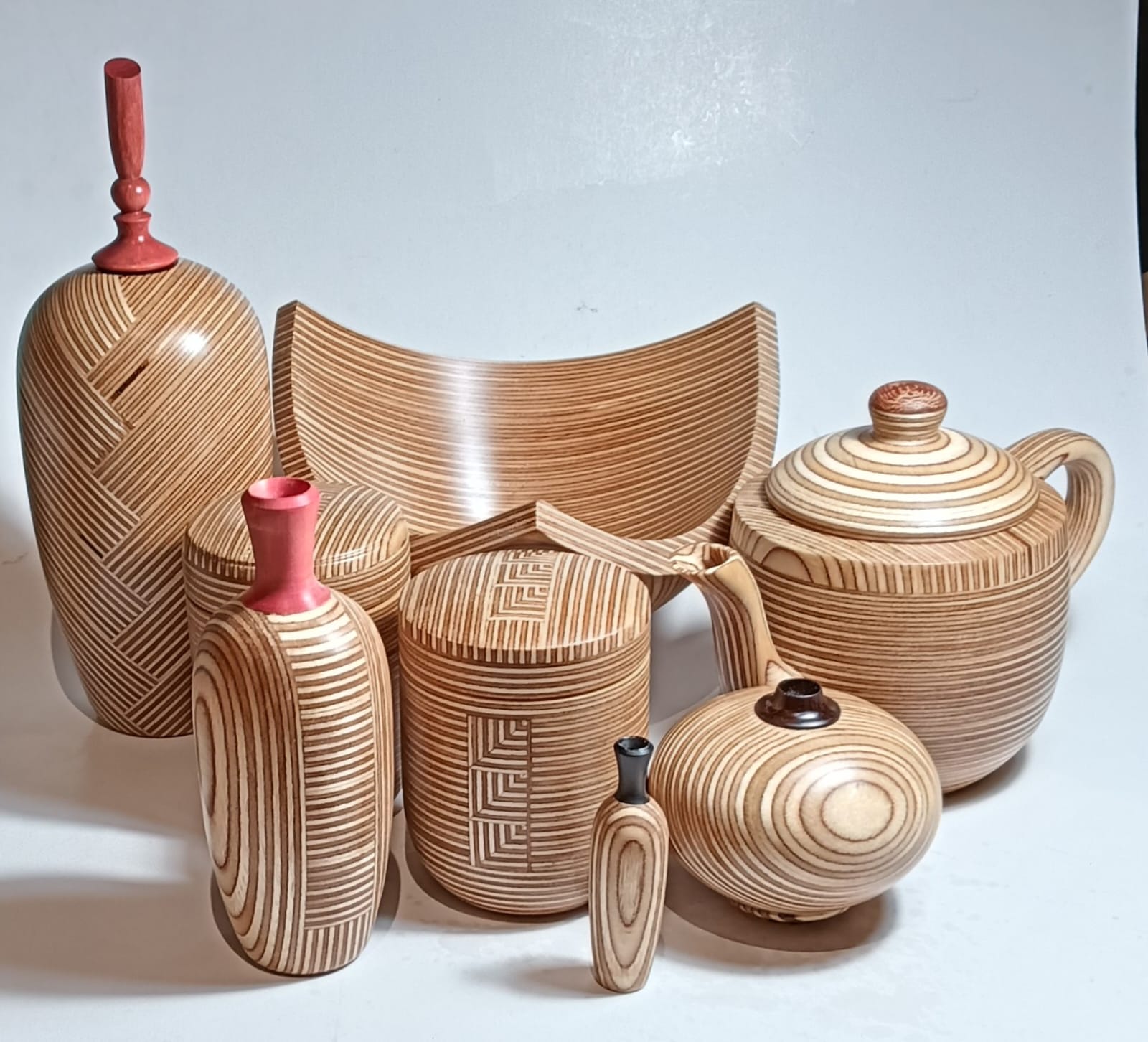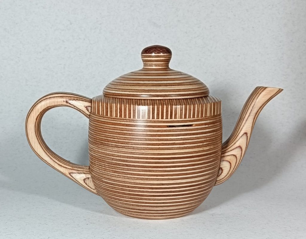 Description: Tea pot in birch ply with waboom on handle