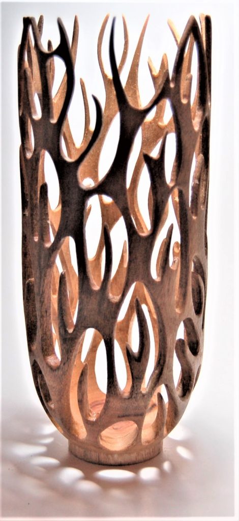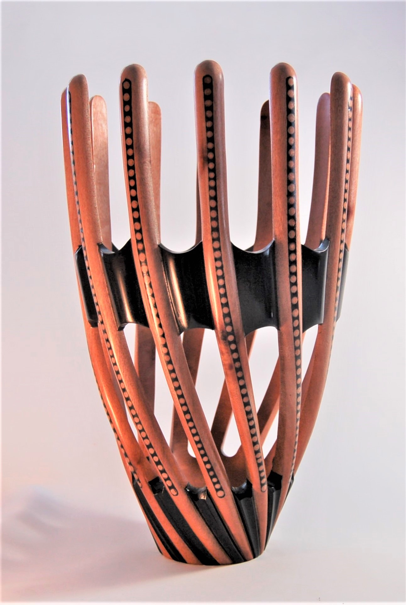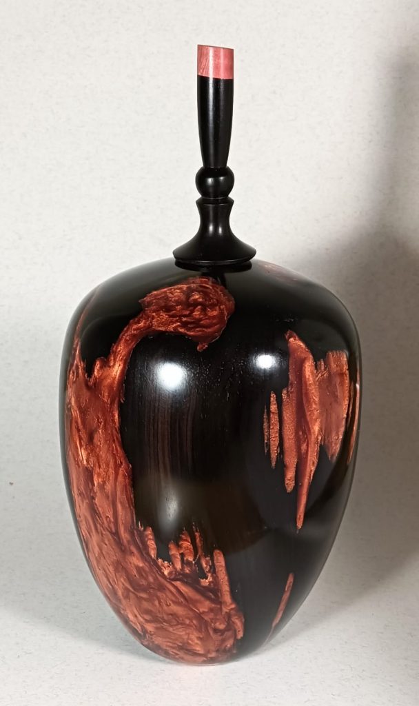 Description: Hollow form and finial in african blackwood with red ivory contrast and copper resin infill.