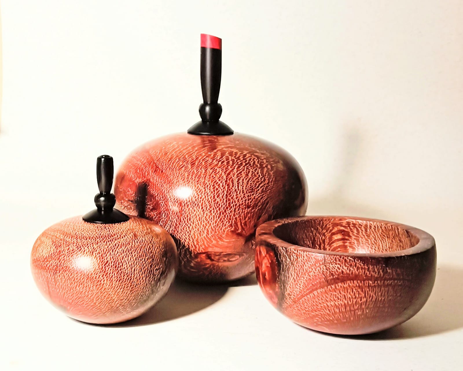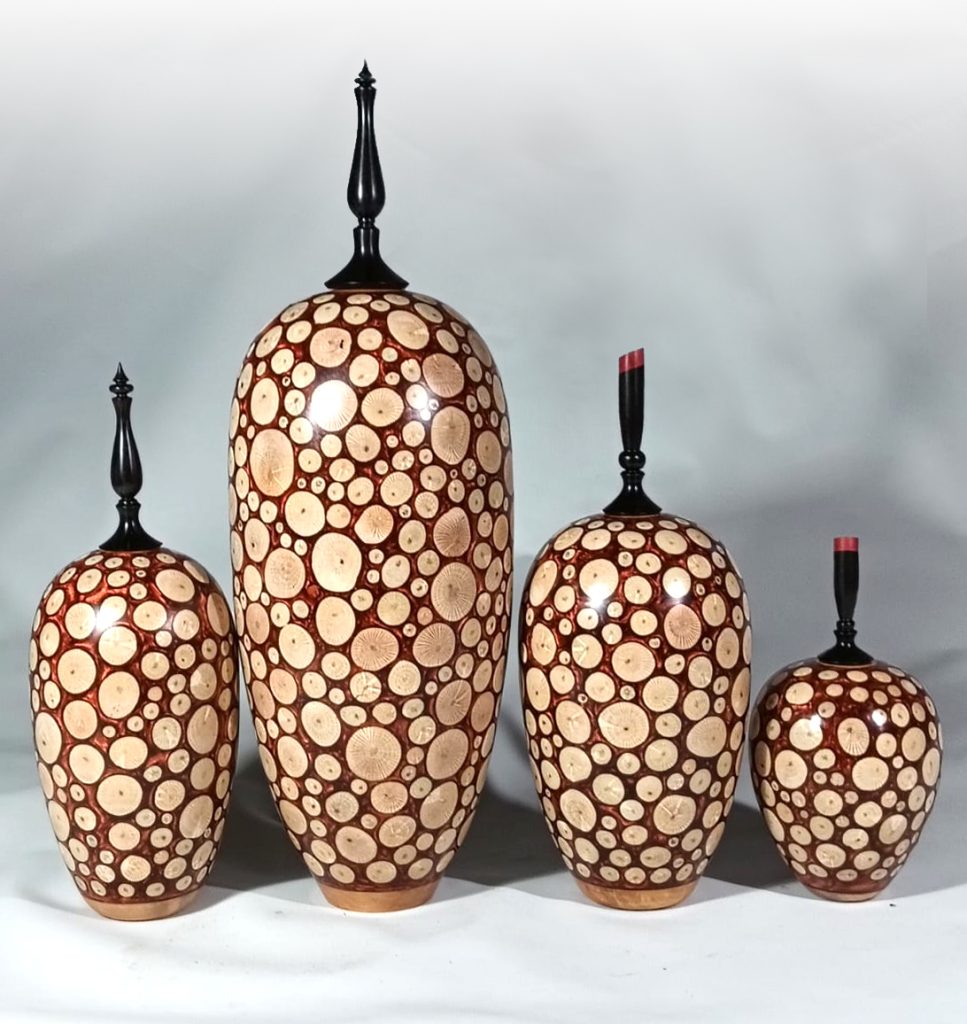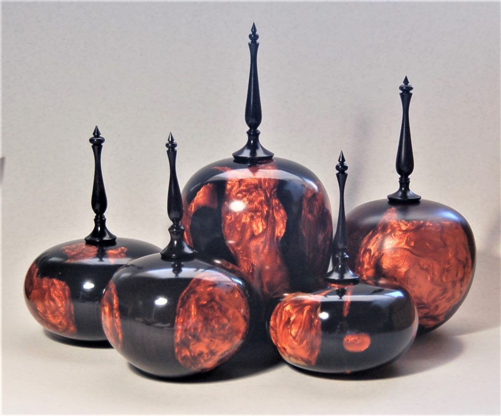 Description: Hollow forms with silky oak cast in copper resin with african blackwood finials . Largest 280x100mm