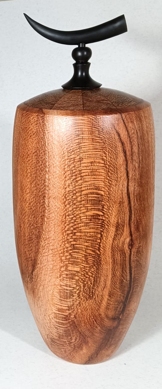 Description: Hollow form and segmented shoulder in boekenhout with horn of springbok ewe on African blackwood. 330x110mm