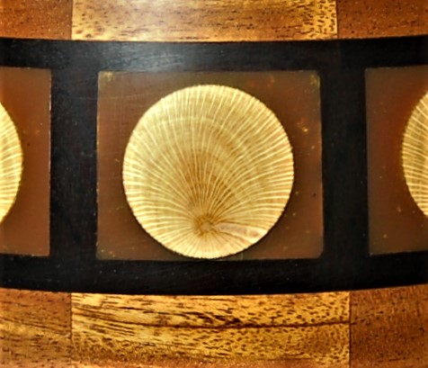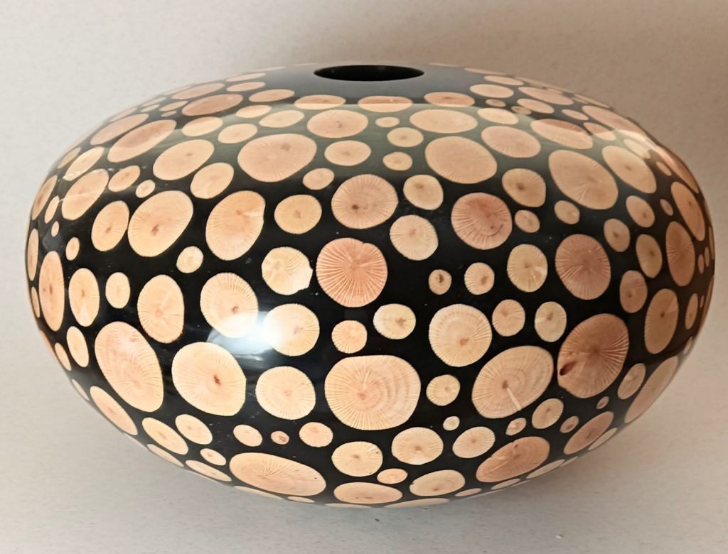 Description: Segmented soft SA pine. 108 turned dots. Semi circles in wet rooikrans , Pyrography and sprayed black Finished with traditional black shoe polish .210x160mm