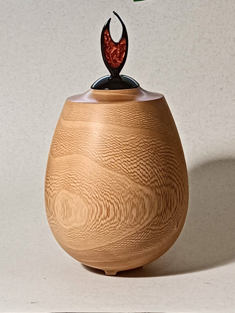 Description: Jacaranda hollow form with zebra and copper resin finial . 260x130mm