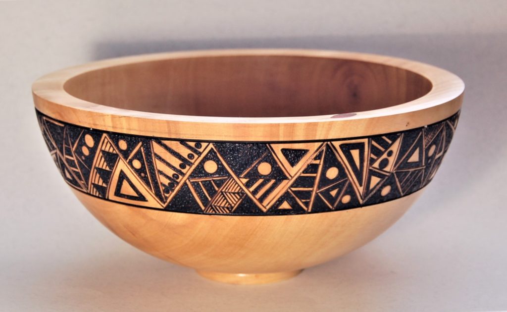 Description: Pyrographed triangles on yellowwood . 200x90mm