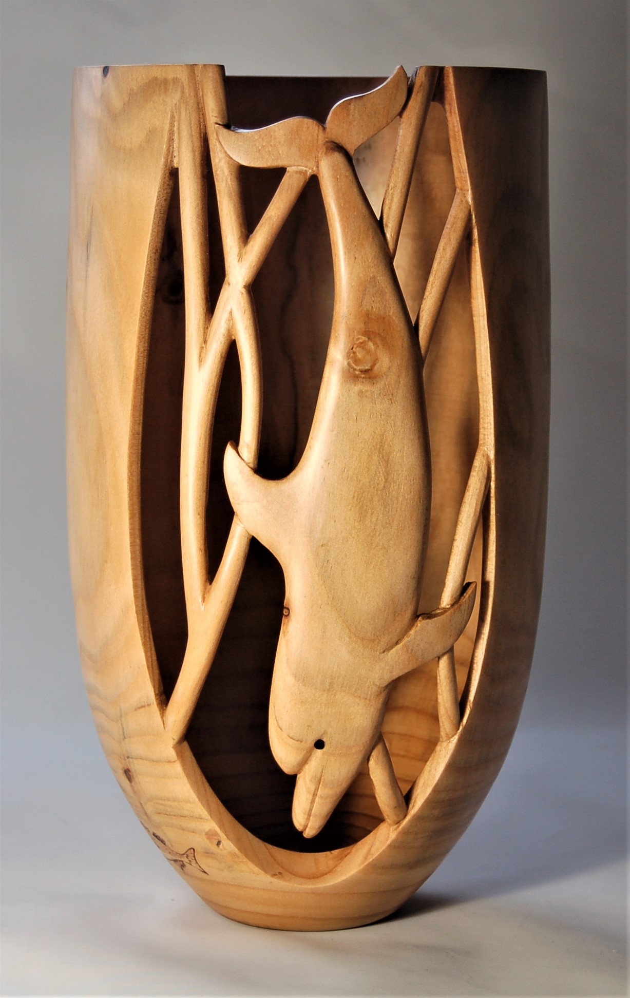 Description: A carved dolphin chasing a school of fish (around the bottom). 290x150mm