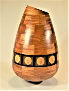 Description: Segmented african mahogany vase with detail band in silky oak cast in amber resin framed with african blackwood . 360×200 mm.